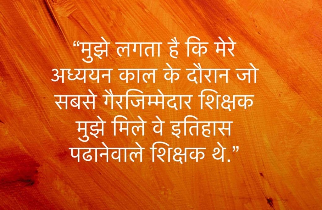 “मुझे लगता है कि मेरे अध्ययन काल के दौरान जो सबसे गैरजिम्मेदार शिक्षक मुझे मिले वे इतिहास पढानेवाले शिक्षक थे. मुझे तो इंजीनियरिंग में आगे बढना था इसीलिए ऐसे शिक्षकों से मुझे कोई आपत्ति नहीं थी. बाकी, वे लोग जो पढाते थे उसका महत्व कितना है इसका मुझे तनिक भी ख्याल नहीं था. इस कारण मेरे आस पास ऐसा वातावरण बना जिसका ऐतिहासिक संदर्भ मेरी पकड में हीं नहीं आया…