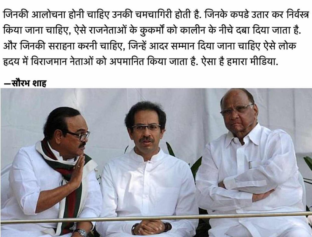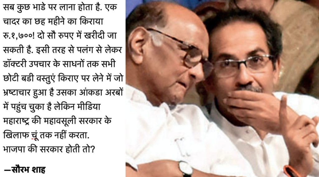 महाराष्ट्र में शिवसेना, एनसीपी और कांग्रेस की तीन टांगों वाली लंगडी सरकार के बजाय यदि भाजपा की सरकार होती तो मीडिया ने मुख्यमंत्री को नोंच डाला होता, सडकों पर प्रदर्शन किए जाते और मीडिया ने जिस प्रकार नकली किसानों के विरोध प्रदर्शन को प्रचारित किया, उसी तरह से इन प्रदर्शनों को भी सुर्खियों में लाया होता कि चीफ मिनिस्टर को सत्ता छोड देनी चाहिए. लेकिन यहां मुख्यमंत्री शिवसेना प्रमुख हैं. भ्रष्ट सरकार द्वारा भ्रष्ट किए गए पत्रकार भीगी बिल्ली की तरह चुप रहे.