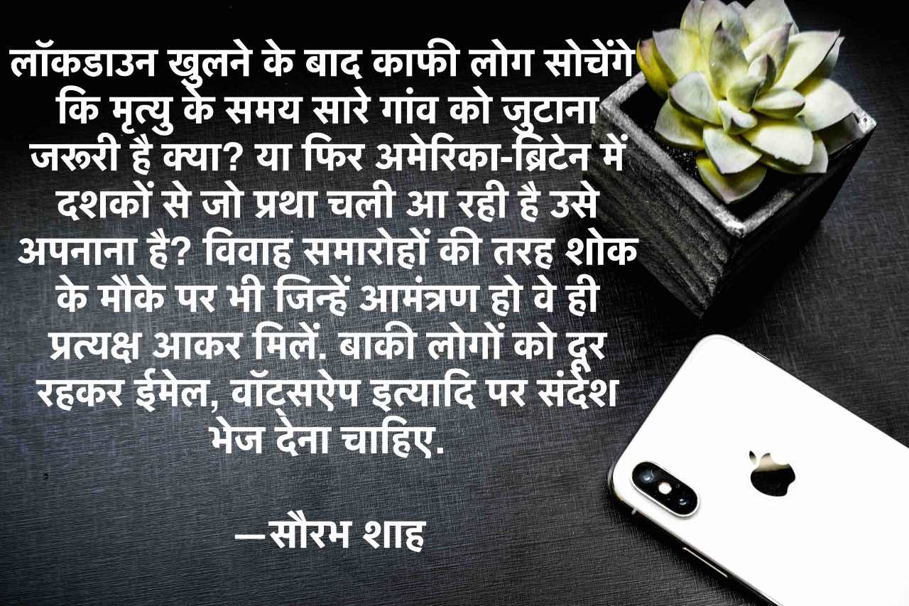 लॉकडाउन के दौरान आनेवाले ये विचार भी स्मशान वैराग्य जैसे ही हो सकते हैं. और शायद न भी हों. लॉकडाउन का अनुभव दो-चार घंटे तक ही सीमित नहीं है. तीन मई को ४० दिन पूरे हो जाएंगे और बाद में चार मई जीवन तुरंत ही सरपट दौडने नहीं वाला. घर से बाहर निकलने की सशर्त छूट मिलेगी लेकिन निजी जीवन, सामाजिक जीवन, व्यक्तिगत आर्थिक परिस्थिति तथा देश की अर्थव्यवस्था- ये सारा कुछ पूर्ववत् होने में महीनों लग जाएंगे, शायद वर्षों भी. और उसके बाद भी कुछ बातें हमेशा के लिए बदल गई होंगी. कौन सी?