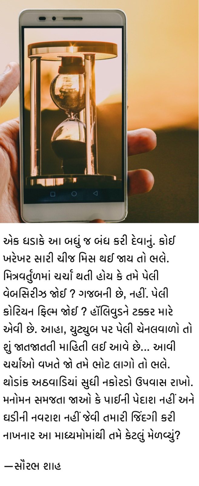 આ બધું રોકવાનો ઉપાય ખરો ? હા, ખરો. એક ધડાકે આ બધું જ બંધ કરી દેવાનું. કોઈ ખરેખર સારી ચીજ મિસ થઈ જાય તો ભલે. મિત્રવર્તુળમાં ચર્ચા થતી હોય કે તમે પેલી વેબસિરીઝ જોઈ ? ગજબની છે, નહીં. પેલી કોરિયન ફિલ્મ જોઈ ? હૉલિવુડને ટક્કર મારે એવી છે. આહા, યુટ્યુબ પર પેલી ચેનલવાળો તો શું જાતજાતતી માહિતી લઈ આવે છે… આવી ચર્ચાઓ વખતે જો તમે ભોટ લાગો તો ભલે. થોડાંક અઠવાડિયાં સુધી નકોરડો ઉપવાસ રાખો. મનોમન સમજતા જાઓ કે પાઈની પેદાશ નહીં અને ઘડીની નવરાશ નહીં જેવી તમારી જિંદગી કરી નાખનાર આ માધ્યમોમાંથી તમે કેટલું મેળવ્યું ? એ બધું ન મેળવ્યું હોત તો તમારા જીવનમાં શું ખૂટતું હોત ? અને જે ખૂટતું હોત તે મેળવવા માટે શું આ જ માધ્યમો છે ? બીજું કોઈ માધ્યમ નથી ? મને ફિલ્મી સંગીત સાંભળવું ગમે છે. અમુક હિન્દી સિનેમાના ગીતો મારા ફેવરિટ છે. પણ એ માટે શું મારે આ માધ્યમોના આશરે જવું જરૂરી છે ? એકાદ એપ ડાઉનલોડ કરીને હું મારા ફુરસદના સમયમાં એમાંના ઘણાં ગીતો સાંભળી શકું છું- એક જમાનામાં રેડિયો પર સાંભળતા હતા એમ.