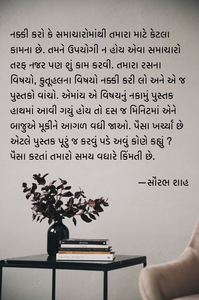 નક્કી કરો કે સમાચારોમાંથી તમારા માટે કેટલા કામના છે. તમને ઉપયોગી ન હોય એવા સમાચારો તરફ નજર પણ શું કામ કરવી. તમારા રસના વિષયો, કુતૂહલના વિષયો નક્કી કરી લો અને એ જ પુસ્તકો વાંચો. એમાંય એ વિષયનું નકામું પુસ્તક હાથમાં આવી ગયું હોય તો દસ જ મિનિટમાં એને બાજુએ મૂકીને આગળ વધી જાઓ. પૈસા ખર્ચ્યા છે એટલે પુસ્તક પૂરું જ કરવું પડે અવું કોણે કહ્યું ? પૈસા કરતાં તમારો સમય વધારે કિંમતી છે. તમારા મિત્રો-જાણકારો-સ્નેહીઓ પાસેથી ટિપ્સ મેળવતા રહો કે તમારા વાચનશોખને પોષે એવાં કયાં કયાં પુસ્તકો છે. જરૂરી નથી કે તેઓ જે રેકમેન્ડ કરે તે બધાં જ પુસ્તકો તમન ગમે.