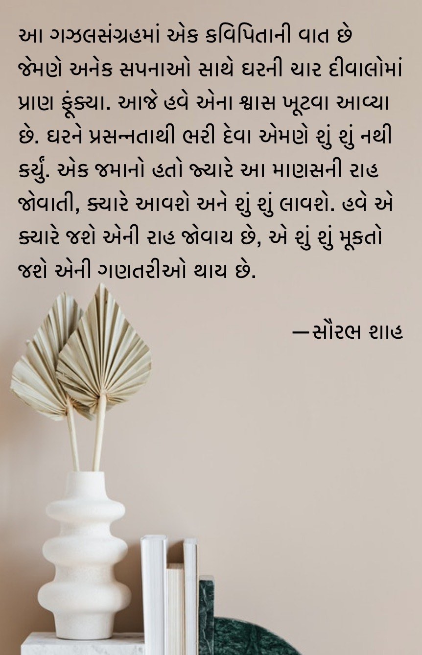આ ગઝલસંગ્રહમાં એક કવિપિતાની વાત છે જેમણે અનેક સપનાઓ સાથે ઘરની ચાર દીવાલોમાં પ્રાણ ફૂંક્યા. આજે હવે એના શ્વાસ ખૂટવા આવ્યા છે. ઘરને પ્રસન્નતાથી ભરી દેવા એમણે શું શું નથી કર્યું. એક જમાનો હતો જ્યારે આ માણસની રાહ જોવાતી, ક્યારે આવશે અને શું શું લાવશે. હવે એ ક્યારે જશે એની રાહ જોવાય છે, એ શું શું મૂકતો જશે એની ગણતરીઓ થાય છે.