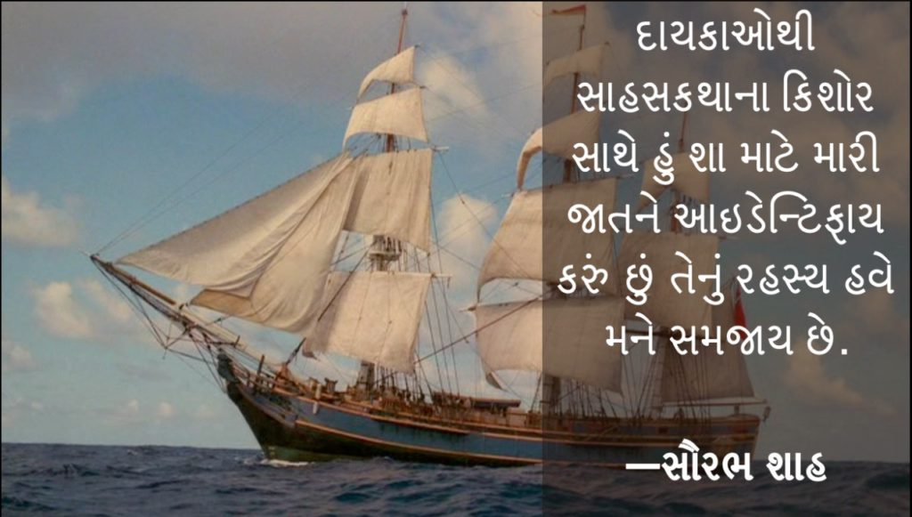 દાયકાઓથી સાહસકથાના કિશોર સાથે હું શા માટે મારી જાતને આઇડેન્ટિફાય કરું છું તેનું રહસ્ય હવે મને સમજાય છે. યશવંતભાઈના પરિચય ટ્રસ્ટમાં નોકરી શરૂ કરી ત્યારે આવી જ કોઈ સાહસ યાત્રાના રોમાંચમાં મારે ભાગ લેવો હશે, કોઈ પણ ભોગે. મધદરિયે વહાણ ડૂબી જશે એવા કોઈ ભય વગર અને ખજાનાના ટાપુ પર પહોંચી જવાશે એવી કોઈ લાલચ વગર.