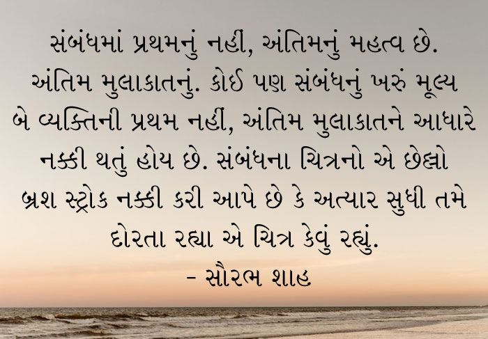 સંબંધમાં પ્રથમનું નહીં, અંતિમનું મહત્વ છે. અંતિમ મુલાકાતનું. કોઈ પણ સંબંધનું ખરું મૂલ્ય બે વ્યક્તિની પ્રથમ નહીં, અંતિમ મુલાકાતને આધારે નક્કી થતું હોય છે. સંબંધના ચિત્રનો એ છેલ્લો બ્રશ સ્ટ્રોક નક્કી કરી આપે છે કે અત્યાર સુધી તમે દોરતા રહ્યા એ ચિત્ર કેવું રહ્યું. ‘મરીઝ’ કહે છે એમ: ‘બધો આધાર છે જતી વેળાના જોવા પર…’