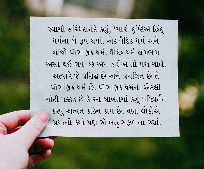 બપોરની ચા પછી સ્વામી સચ્ચિદાનંદજીને પહેલો પ્રશ્ન કરતાં મેં કહ્યું, ‘બાપજી, સવારની વાતના અનુસંધાનમાં મને એક પ્રશ્ન એવો થાય કે સ્વામી દયાનંદ સરસ્વતીએ જે રીતે પુરાણોનો નકાર કર્યો એમ જો આજના જમાનામાં આપણે પુરાણોનો નકાર કરીએ તો એની અસર શું પડે સમાજ પર? અને એવું કરવાથી આપણા ધર્મને, હિન્દુત્વને કંઈ નુકસાન થાય?’