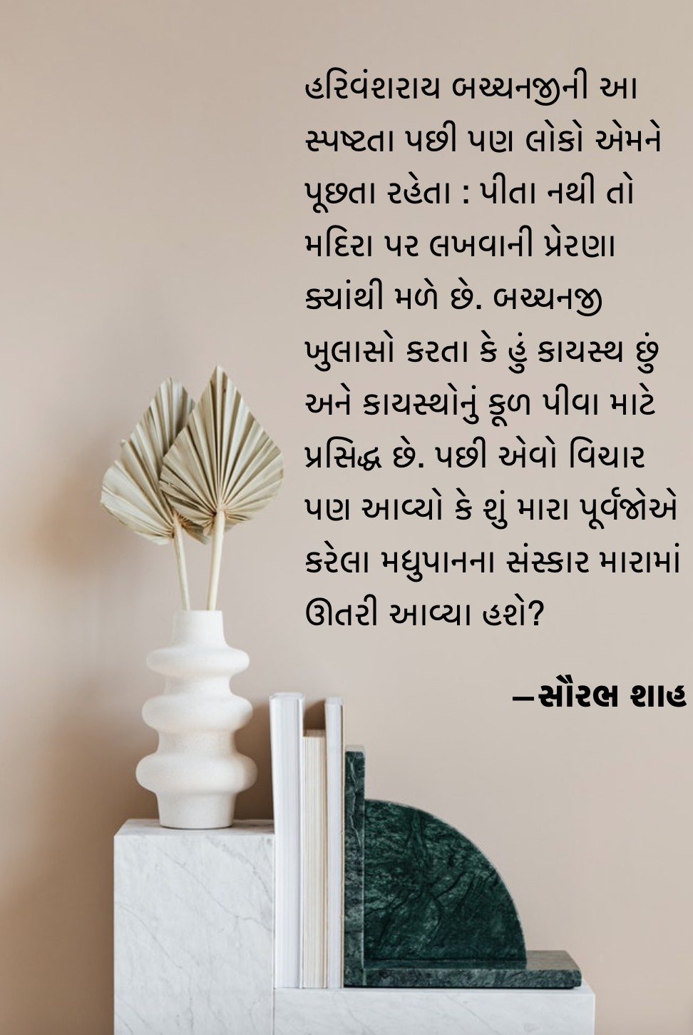 શરાબ અને શાયરીને શું કોઈ અતૂટ સંબંધ છે? કદાચ હા, કદાચ ના. ખબર નથી, પણ એટલી જરૂર ખબર છે કે કવિ હરિવંશરાય બચ્ચને જે રીતે શરાબની વાત કરી છે તેવી રીતે બીજા કોઈ કવિ કે શાયરે નથી કરી. આવી વાતને તો ગાલિબથી માંડીને ‘મરીઝ’ સુધીના અનેક જાનદાર શાયરો પોતપોતાની રીતે શબ્દસ્થ કરી ચૂક્યા છે. આ તમામ શાયરોના મદ્ય વિશેના સેંકડો શેરમાંથી ગાલિબનો એક શેર ટાંકીને હરિવંશરાય બચ્ચનની ‘મધુશાલા’ વિશેના આ લેખની પૂર્વભૂમિકા બાંધીએ.