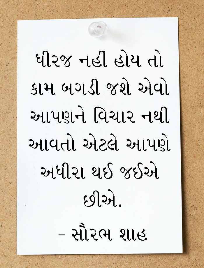 ઉતાવળે આંબા ન પાકે અને ધીરજનાં ફળ મીઠાં એ સૌ જાણે છે પણ આ જાણકારીને અમલમાં મૂકવાની આવે છે ત્યારે? ત્યારે આપણામાંના મોટાભાગના એ કસોટીમાં નાપાસ થઈએ છીએ કારણ કે આપણે આ વાતને બરાબર સમજ્યા નથી અને એ અર્ધસમજણ આપણને અધીરા બનાવી દે છે.
