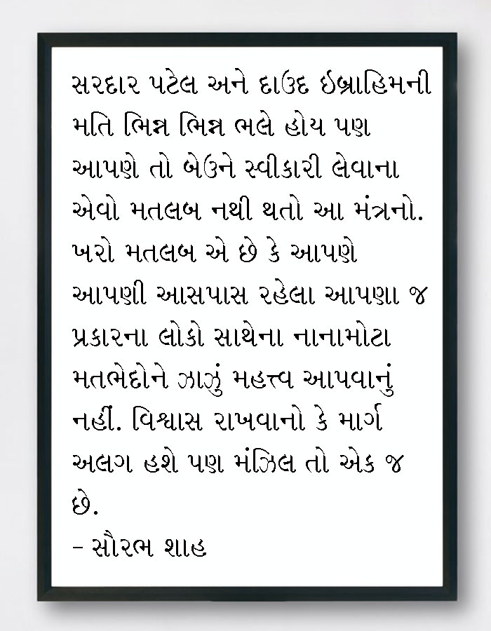 અને છેલ્લે મુંડે મુંડે મતિર્ભિન્ના… આનો અર્થ એ નથી કે કૃષ્ણ અને કંસ બેઉની મતિ ભિન્ન છે એટલે એ તો સ્વાભાવિક કહેવાય અને એ બેઉને સમાજમાં રહેવાનો હક્ક છે એવું તમે સ્વીકારો. સરદાર પટેલ અને દાઉદ ઇબ્રાહિમની મતિ ભિન્ન ભિન્ન ભલે હોય પણ આપણે તો બેઉને સ્વીકારી લેવાના એવો મતલબ નથી થતો આ મંત્રનો.ખરો મતલબ એ છે કે આપણે આપણી આસપાસ રહેલા આપણા જ પ્રકારના લોકો સાથેના નાનામોટા મતભેદોને ઝાઝું મહત્ત્વ આપવાનું નહીં. વિશ્વાસ રાખવાનો કે માર્ગ અલગ હશે પણ મંઝિલ તો એક જ છે. સરદાર પટેલ જયારે વકીલાતનું ભણવા વિલાયત ગયા અને બૅરિસ્ટર બનીને પાછા આવ્યા ત્યારે સૂટ-બૂટ પહેરતા હતા. એ સમયની, એ વખતની સમજની એ આવશ્યકતા હતી. તમારે એમના એ વખતના પહેરવેશની ટીકા નથી કરવાની. ગાંધીજીના કોઈ એક કે એકથી વધુ વિચારો સાથે અસહમતિ હોય તો ભલે હોય. સરદાર પટેલ ગાંધીજીના નિકટતમ સાથી હતા. આરંભના દિવસોમાં સરદારનું સરદારપણું બહાર લાવવામાં ગાંધીજીનો ઘણો મોટો ફાળો. સરદારે શું કામ ગાંધીજી સામે બળવો ન કર્યો, કે પોતાનો અલગ ચોકો કેમ ન કર્યો એવું વિચારીને તમારે સરદારની ટીકા ન કરવાની હોય. સરદાર પટેલને એમના પોતાના વિચારો હોવાના, એમને પોતાના લિમિટેશન્સ પણ હોય.