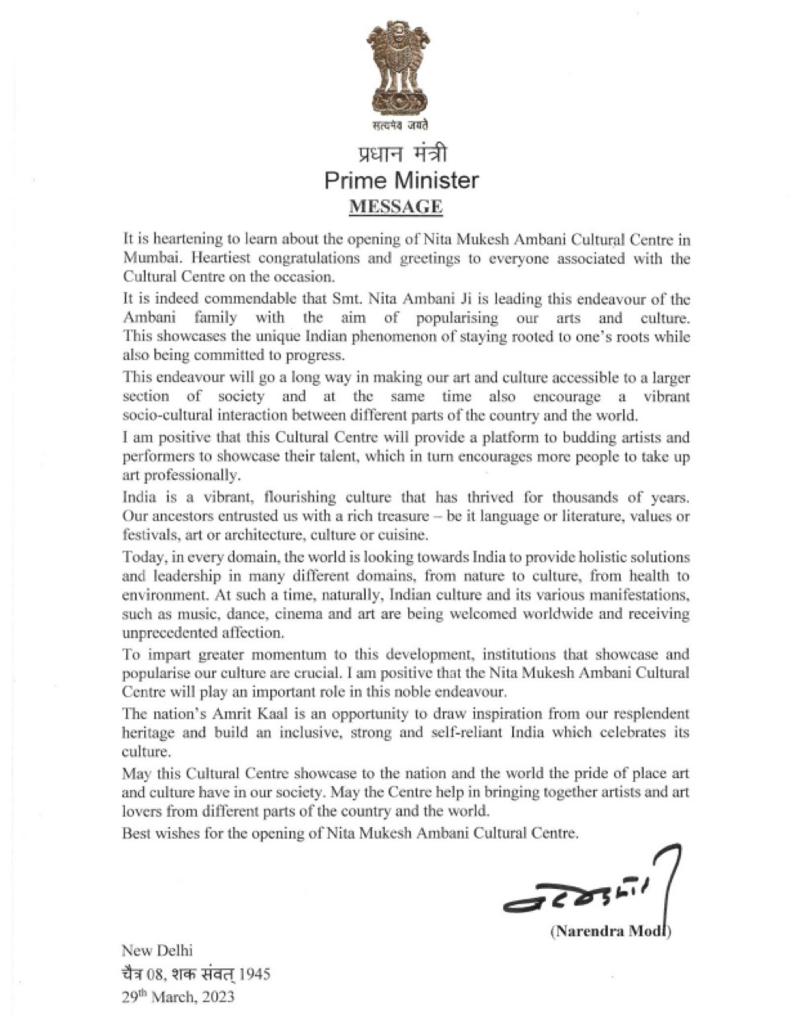 મોદીજીનો સંદેશ વાંચવો ગમ્યો. તેમણે ભારતની પરંપરાગત કલા અને સંસ્કૃતિની જાણ તેમજ આસ્વાદ અંતે ભારતીય પ્રજાનો બહોળો વર્ગ માણે તેવી આશા વ્યક્ત કરી . પ્રજા વત્સલ મોદીજીને નમન 👏.