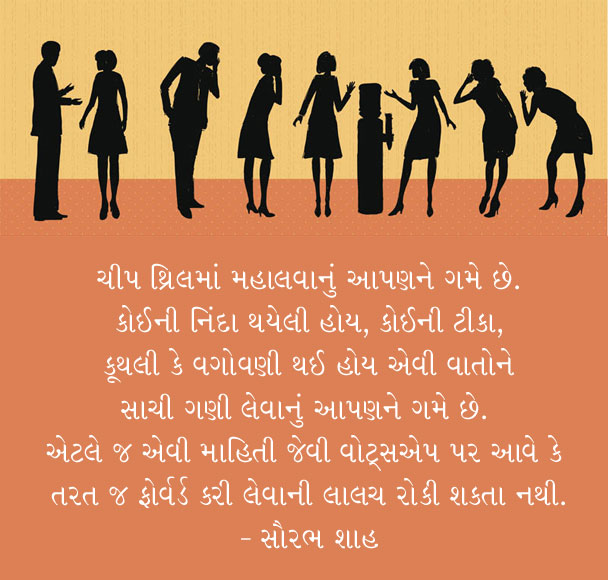 પણ આપણે આળસુ છીએ. ચીપ થ્રિલમાં મહાલવાનું આપણને ગમે છે. કોઈની નિંદા થયેલી હોય, કોઈની ટીકા, કૂથલી કે વગોવણી થઈ હોય એવી વાતોને સાચી ગણી લેવાનું આપણને ગમે છે. એટલે જ એવી માહિતી જેવી વૉટ્સઍપ પર આવે કે તરત જ ફૉરવર્ડ કરી લેવાની લાલચ રોકી શકતા નથી.