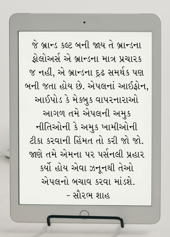 જે બ્રાન્ડ કલ્ટ બની જાય તે બ્રાન્ડના ફૉલોઅર્સ એ બ્રાન્ડના માત્ર પ્રચારક જ નહીં, એ બ્રાન્ડના દૄઢ સમર્થક પણ બની જતા હોય છે. એપલનાં આઈફોન, આઈપોડ કે મૅકબુક વાપરનારાઓ આગળ તમે એપલની અમુક નીતિઓની કે અમુક ખામીઓની ટીકા કરવાની હિંમત તો કરી જો જો. જાણે તમે એમના પર પર્સનલી પ્રહાર કર્યો હોય એવા ઝનૂનથી તેઓ એપલનો બચાવ કરવા માંડશે. અમિતાભ બચ્ચનના કે શાહરૂખ ખાનના ચાહકો એમની નબળી ફિલ્મોનો પણ ઝનૂનપૂર્વક બચાવ કરશે. કારણ કે કલ્ટ બ્રાન્ડના ફૉલોઅર્સ માટે આ બ્રાન્ડસ પોતાના અંગત જીવનનો એક હિસ્સો બની જાય છે. એમના સમગ્ર વ્યક્તિત્વનું એક અભિન્ન અંગ બની જાય છે. એમની ખામીઓને પણ તેઓ જસ્ટિફાય કરતા થઈ જાય છે. પોતાના અસ્તિત્વ કરતાં પણ વધારે એમને એ બ્રાન્ડ સાથે જોડાયેલા રહેવું વધુ અગત્યનું લાગતું હોય છે. તેઓ પોતાના વિશે થતી ગેરવાજબી ટીકા પણ કદાચ સહન કરી લેશે પણ પોતે જે કલ્ટ બ્રાન્ડના વપરાશકાર છે તે બ્રાન્ડની વાજબી ટીકા પણ નહીં સાંખી લે. આને લીધે એ કલ્ટ બ્રાન્ડની જવાબદારી ઔર વધી જતી હોય છે.