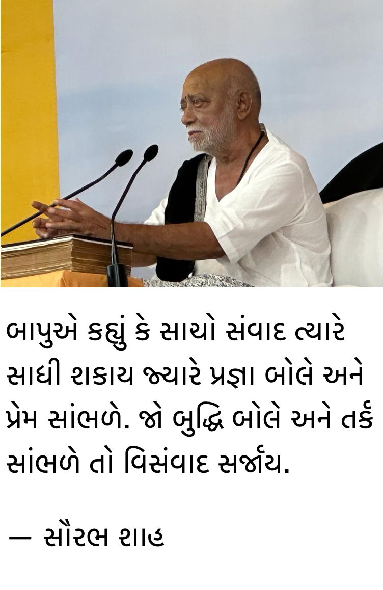 ત્રીજા દિવસે બાપુએ કહ્યું કે સાચો સંવાદ ત્યારે સાધી શકાય જ્યારે પ્રજ્ઞા બોલે અને પ્રેમ સાંભળે. જો બુદ્ધિ બોલે અને તર્ક સાંભળે તો વિસંવાદ સર્જાય. ચતુરાઈથી, ઝાકઝમાળભર્યા શબ્દોની જાળ ફેલાવીને શ્રોતાઓને ચકિત-ભ્રમિત કરી નાખતા વક્તાઓ – પ્રવચનકારોને બાપુ ઓળખી ગયા છે. કમનસીબે ગુજરાતી શ્રોતાઓ આ પ્રકારના સુપર સ્માર્ટ વક્તાઓની ખોખલી વાણીથી અંજાતા રહે છે.