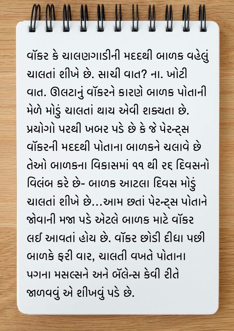 ૪. વૉકર કે ચાલણગાડીની મદદથી બાળક વહેલું ચાલતાં શીખે છે. સાચી વાત? ના. ખોટી વાત. ઊલટાનું વૉકરને કારણે બાળક પોતાની મેળે મોડું ચાલતાં થાય એવી શક્યતા છે. પ્રયોગો પરથી ખબર પડે છે કે જે પેરન્ટ્સ વૉકરની મદદથી પોતાના બાળકને ચલાવે છે તેઓ બાળકના વિકાસમાં ૧૧ થી ૨૬ દિવસનો વિલંબ કરે છે- બાળક આટલા દિવસ મોડું ચાલતાં શીખે છે. વૉકરને લીધે બાળક પોતાનાં પગની હલનચલન જોઈ શકતું નથી. વૉકરને કારણે બાળકને પોતાની મેળે શરીર બૅલેન્સ કરતાં આવડતું નથી.