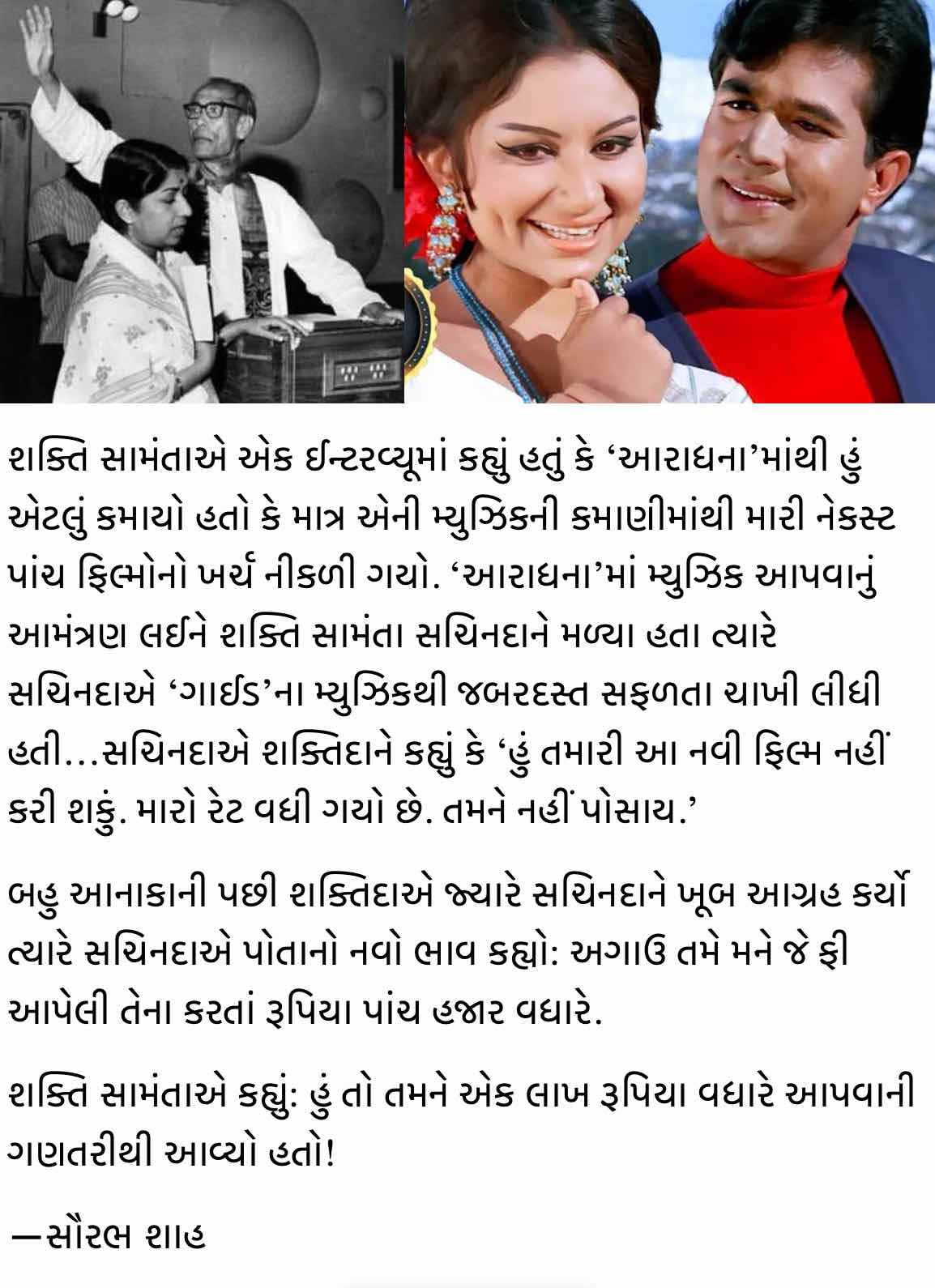 અને ત્રીજી ફિલ્મ તે ‘આરાધના’ જેણે રાજેશ ખન્ના અને કિશોર કુમારની કરિયરનો ગ્રાફ ઉપર લઈ જવામાં જબરદસ્ત ફાળો આપ્યો. અફકોર્સ, આનંદ બક્ષી ‘જબ જબ ફૂલ ખીલે’થી સુપરહિટ ગીતકાર તરીકે જાણીતા હતા જ, પરંતુ ‘આરાધના’ પછી એમની ગણના ટૉપ ક્લાસ ગીતકારોમાં થવા લાગી. ચોથી વ્યક્તિ જેને ‘આરાધના’એ મ્યુઝિક ડાયરેક્ટર તરીકેની કરિયરમાં જબરદસ્ત બૂસ્ટ આપ્યો તે હતા સચિન દેવ બર્મનના આસિસ્ટન્ટ રાહુલ દેવ બર્મન. શક્તિ સામંતાના એ ‘આરાધના’ના બંગાળી વર્ઝનનાં પોસ્ટર્સ તથા હોર્ડિંગ્સમાં સંગીતકાર પિતા ઉપરાંત એમના પુત્રને પણ આસિસ્ટન્ટ તરીકે ક્રેડિટ આપી હતી. ફિલ્મોમાં મદદનીશ સંગીતકારને આટલી મોટી ક્રેડિટ હજુ સુધી ક્યારેય નહોતી મળી. શક્તિ સામંતાએ એક ઈન્ટરવ્યૂમાં કહ્યું હતું કે ‘આરાધના’માંથી હું એટલું કમાયો હતો કે માત્ર એની મ્યુઝિકની કમાણીમાંથી મારી નેકસ્ટ પાંચ ફિલ્મોનો ખર્ચ નીકળી ગયો. ‘આરાધના’માં મ્યુઝિક આપવાનું આમંત્રણ લઈને શક્તિ સામંતા સચિનદાને મળ્યા હતા ત્યારે સચિનદાએ ‘ગાઈડ’ના મ્યુઝિકથી જબરદસ્ત સફળતા ચાખી લીધી હતી. હાલાકિ સચિનદા માટે આવી સફળતાઓ નવી નવાઈની નહોતી. ‘ગાઈડ’ આજે એક ક્લાસિક ફિલ્મ ગણાય છે, પણ રિલીઝ વખતે બૉક્સ ઑફિસ પર સુપરહિટ પુરવાર નહોતી થઈ, એનું સંગીત સુપરડુપર હિટ સાબિત થયેલું. સચિનદાએ શક્તિદાને કહ્યું કે ‘હું તમારી આ નવી ફિલ્મ નહીં કરી શકું. મારો રેટ વધી ગયો છે. તમને નહીં પોસાય.’