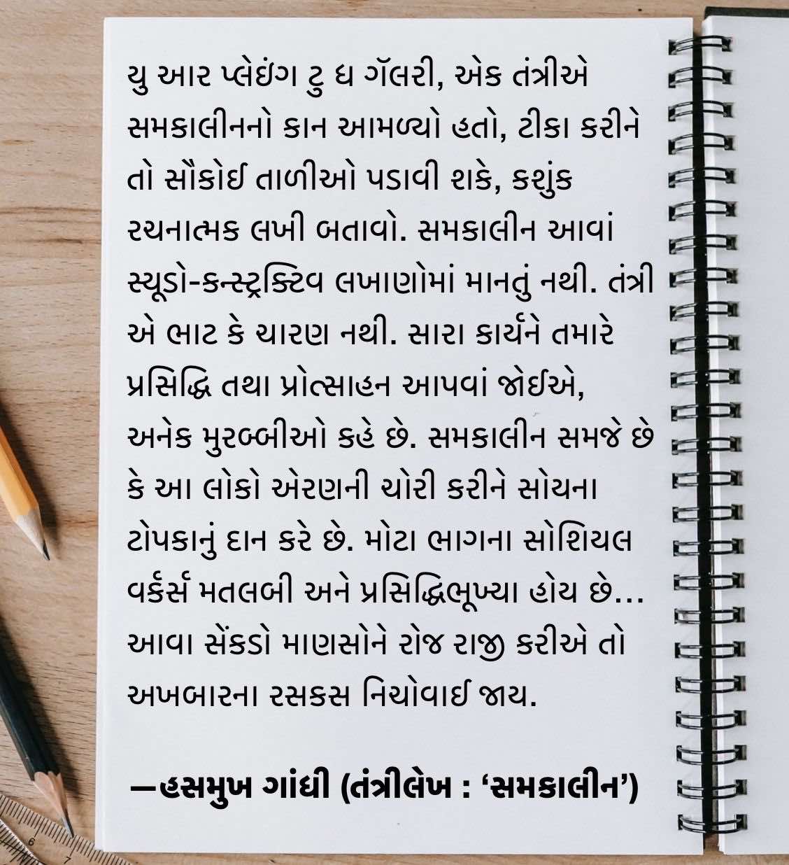 યુ આર પ્લેઇંગ ટુ ધ ગૅલરી, એક તંત્રીએ સમકાલીનનો કાન આમળ્યો હતો, ટીકા કરીને તો સૌકોઈ તાળીઓ પડાવી શકે, કશુંક રચનાત્મક લખી બતાવો. સમકાલીન આવાં સ્યૂડો-કન્સ્ટ્રક્ટિવ લખાણોમાં માનતું નથી. તંત્રી એ ભાટ કે ચારણ નથી. સારા કાર્યને તમારે પ્રસિદ્ધિ તથા પ્રોત્સાહન આપવાં જોઈએ, અનેક મુરબ્બીઓ કહે છે. સમકાલીન સમજે છે કે આ લોકો એરણની ચોરી કરીને સોયના ટોપકાનું દાન કરે છે. મોટા ભાગના સોશિયલ વર્કર્સ મતલબી અને પ્રસિદ્ધિભૂખ્યા હોય છે. મોટા ભાગના સોશિયલ વર્કર્સ વ્યવસાયી રાહત કાર્યકરો જેવા હોય છે. આવા લોકો વ્યવસાયી પત્રકારોને દક્ષિણા આપીને પોતાનાં ડાચાં છાપાંના વાચકોને માથે મારી જાય છે. પછી તો હિન્દી સિનેમાની જેમ (વિલન જોઈએ, નાચનારી જોઈએ, મોટરકારની રેસ જોઈએ, અદાલતી દશ્ય જોઈએ, રીંછ કે કૂતરો જોઈએ, દસ ગાયન જોઈએ, મોટા સ્ટાર જોઈએ, વિદૂષક જોઈએ વગેરે વગેરે) ગુજરાતી અખબારો માટે પણ ખોટાં નોર્મ્સ સ્થપાય છે. તંત્રીને મળવા જાઓ અને જે કાંઈ આપો તે છપાય જ એવા વિશ્વાસ સાથે માણસોનાં ટોળાં આવે છે. તેઓ સ્પષ્ટ ના સ્વીકારવા તૈયાર નથી હોતા અને તેમને આંચકો લાગે છે. આવા સેંકડો માણસોને રોજ રાજી કરીએ તો અખબારના રસકસ નિચોવાઈ જાય. સમકાલીને સાદી, શિષ્ટ પણ અસરકારક ભાષા વિકસાવી છે. હેક્નિડ છાપાળવા શબ્દો તેણે વીણી કાઢીને ફેંકી દીધા છે. ચકોર વાચકો ઘણી વાર અન્યોને સમકાલીનનું કઢંગું અનુકરણ કરતા જોઈને ગાલમાં હસે છે.