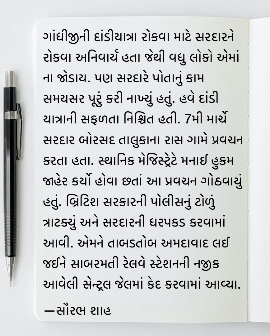 7-3-1930ના શુક્રવારથી સરદારે પોતાની જેલયાત્રાની ડાયરી લખવાનું શરૂ કર્યું એમાં પહેલા દિવસની નોંધ છેઃ ‘રાતના આઠ વાગ્યે સેન્ટ્રલ જેલ સાબરમતીમાં, બોરસદથી ડે.સુ.મિ. બીલીમોરિયા મૂકી ગયા. પકડતાં તેમજ છૂટા પડતાં (હું) ખૂબ રોયો. રસ્તામાં ખૂબ ભલમનસાઈથી વર્ત્યો. રાતે જેલમાં ક્વૉરેન્ટિન વૉર્ડ કહે છે તેમાં રાખ્યો. ત્યાં ત્રણ કામળી આપવામાં આવી. તે પાથરી સૂઈ રહ્યો.’