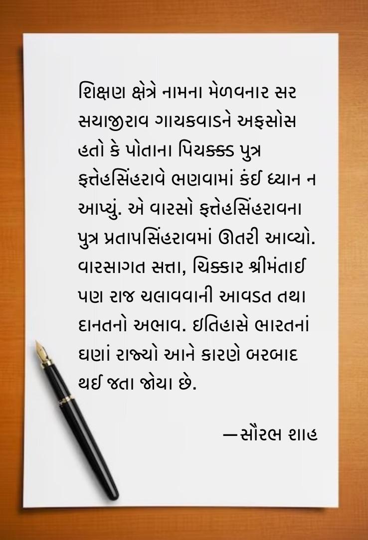 1939માં સર સયાજીરાવ ગાયકવાડના પૌત્ર સર પ્રતાપસિંહ ગાયકવાડને વડોદરાની ગાદી મળી. (સયાજીરાવ ગાયકવાડ (ત્રીજા) શરાબને હાથ પણ લગાડતા નહોતા. પણ એમના પુત્ર અને ભાવિ વારસદાર ફત્તેહસિંહરાવ ભારે શોખીન હતા જેઓ 23 વર્ષની કાચી ઉંમરે, કદાચ આ શોખને કારણે જ રાજગાદી પર આવે તે પહેલાં જ અવસાન પામ્યા.) 1939માં સર સયાજીરાવના સ્વર્ગવાસ પછી જે રાજગાદી ફત્તેહસિંહરાવને મળવી જોઈતી હતી તે તેમના પુત્ર પ્રતાપસિંહરાવને મળી. શિક્ષણ ક્ષેત્રે નામના મેળવનાર સર સયાજીરાવને અફસોસ હતો કે પોતાના પિયક્ક્ડ પુત્ર ફત્તેહસિંહરાવે ભણવામાં કંઈ ધ્યાન ન આપ્યું. એ વારસો ફત્તેહસિંહરાવના પુત્ર પ્રતાપસિંહરાવમાં ઊતરી આવ્યો. વારસાગત સત્તા, ચિક્કાર શ્રીમંતાઈ પણ રાજ ચલાવવાની આવડત તથા દાનતનો અભાવ. ઇતિહાસે ભારતનાં ઘણાં રાજ્યો આને કારણે બરબાદ થઈ જતા જોયા છે.