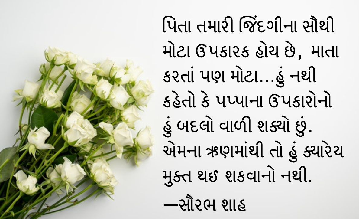 પિતા તમારી જિંદગીના સૌથી મોટા ઉપકારક હોય છે, માતા કરતાં પણ મોટા. માબાપ ઉપરાંત જિંદગીમાં અગણિત ઉપકાર કરનારાઓ હોય છે. હું નથી કહેતો કે પપ્પાના ઉપકારોનો હું બદલો વાળી શક્યો છું. એમના ઋણમાંથી તો હું ક્યારેય મુક્ત થઈ શકવાનો નથી.
