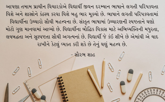 આપણા તમામ પ્રાચીન વિચારકોએ વિદ્યાર્થી જીવન દરમ્યાન ભાષાને લગતી પરિપકવતા વિશે અને શાસ્ત્રોને કંઠસ્થ કરવા વિશે બહુ ભાર મૂક્યો છે. ભાષાને લગતી પરિપકવતામાં વિદ્યાર્થીના ઉચ્ચારો સૌથી મહત્ત્વના છે. સંસ્કૃત ભાષામાં ઉચ્ચારણની સ્પષ્ટતાને ઘણો મોટો ગુણ માનવામાં આવ્યો છે. વિદ્યાર્થીના બૌદ્ધિક વિકાસ માટે અભિવ્યક્તિની મધુરતા, લયબદ્ધતા અને સુસ્પષ્ટતા સૌથી અગત્યનાં છે. વિદ્યાર્થી જે કંઈ શીખે છે એમાંથી એ યાદ રાખીને કેટલું વ્યકત કરી શકે છે તેનું ઘણું મહત્ત્વ છે. પ્રાચીન કાળમાં વિદ્યાર્થીને પ્રારંભથી જ ‘શિક્ષણ સૂત્ર’ શીખવાડવામાં આવતા. આ સૂત્રો આજની તારીખે પણ એટલા જ રિલેવન્ટ છે. આ ‘શિક્ષણ સૂત્ર’માં યાજ્ઞવલ્ક્ય શિક્ષણ, પાણિનીય શિક્ષણ, માંડુકી શિક્ષણ ઈત્યાદિ સૌથી મહત્ત્વનાં છે.