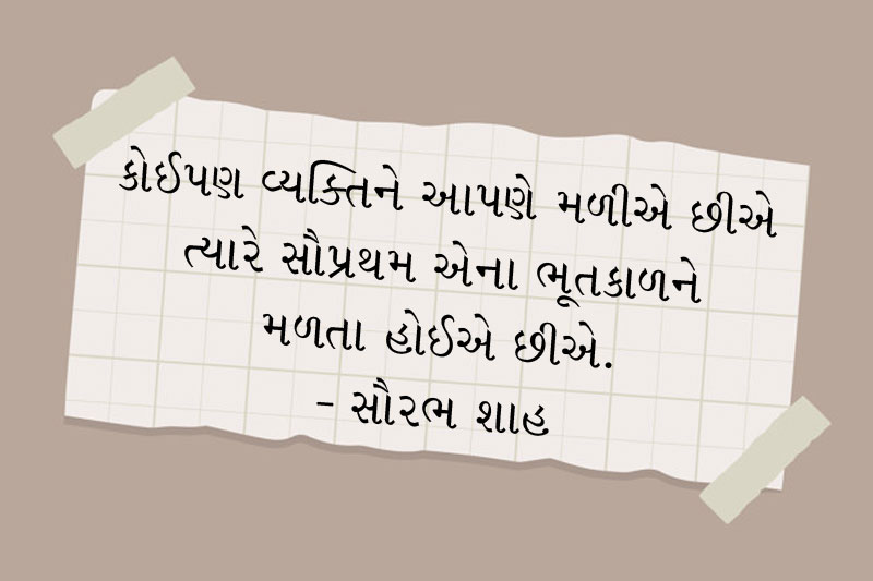 કોઈપણ વ્યક્તિને આપણે મળીએ છીએ ત્યારે સૌપ્રથમ એના ભૂતકાળને મળતા હોઈએ છીએ. તમને ખબર પડતી હોય છે કે સામેની વ્યક્તિ કેટલી ભણેલી છે અર્થાત્ ભૂતકાળમાં કેટલો અભ્યાસ કરી ચૂકેલી છે. સામેની વ્યક્તિ ક્યા ક્ષેત્રમાં શું કરી રહી છે અર્થાત્ એણે પોતાના ક્ષેત્રમાં કેટકેટલી ઉડાનો ભરેલી છે કે પછડાટો ખાધેલી છે. વ્યક્તિ સાથેના પ્રથમ પરિચય વખતે તમારી ઓળખાણ એના ભૂતકાળ સાથે થતી હોય છે. કાં તો તમને એ ભૂતકાળ ગમવા લાગે છે અથવા એ ભૂતકાળ માટે તમને અણગમો ઊપજવા લાગે છે.