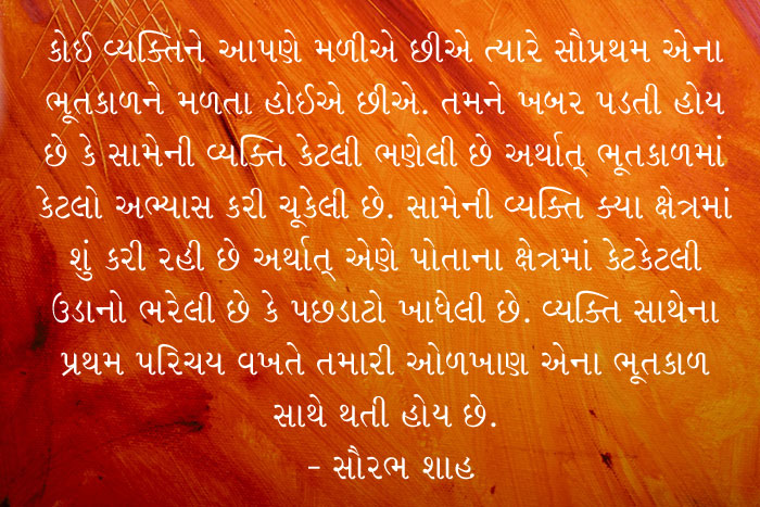 વ્યક્તિને આપણે મળીએ છીએ ત્યારે સૌપ્રથમ એના ભૂતકાળને મળતા હોઈએ છીએ. તમને ખબર પડતી હોય છે કે સામેની વ્યક્તિ કેટલી ભણેલી છે અર્થાત્ ભૂતકાળમાં કેટલો અભ્યાસ કરી ચૂકેલી છે. સામેની વ્યક્તિ ક્યા ક્ષેત્રમાં શું કરી રહી છે અર્થાત્ એણે પોતાના ક્ષેત્રમાં કેટકેટલી ઉડાનો ભરેલી છે કે પછડાટો ખાધેલી છે. વ્યક્તિ સાથેના પ્રથમ પરિચય વખતે તમારી ઓળખાણ એના ભૂતકાળ સાથે થતી હોય છે. કાં તો તમને એ ભૂતકાળ ગમવા લાગે છે અથવા એ ભૂતકાળ માટે તમને અણગમો ઊપજવા લાગે છે. આ ભૂતકાળ એની પાસે ટકી રહ્યો છે, સ્મૃતિને કારણે. સ્મૃતિ ન હોત તો ભૂતકાળ ધરબાઈ જતો હોત કોઈ અતલ ઊંડાણમાં ભૂતકાળના આધારે પસંદ-નાપસંદ પડેલી વ્યક્તિના વર્તમાનમાં તમે પ્રવેશો છો તે પછી તમારાં બેઉનાં ભવિષ્ય એકમેક સાથે જોડાતાં હોય એવું લાગે છે. વાસ્તવમાં તો પ્રથમ પરિચય બાદ બે ભૂતકાળ એકબીજા સાથે જોડાઈ જતા હોય છે.