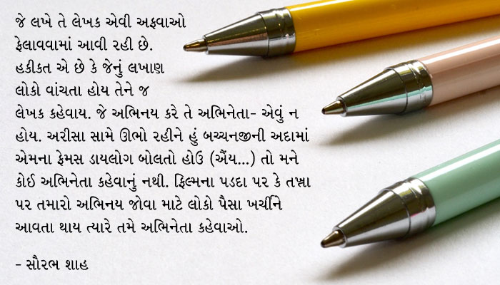 જે લખે તે લેખક એવી અફવાઓ ફેલાવવામાં આવી રહી છે. હકીકત એ છે કે જેનું લખાણ લોકો વાંચતા હોય તેને જ લેખક કહેવાય. જે અભિનય કરે તે અભિનેતા— એવું ન હોય. અરીસા સામે ઊભો રહીને હું બચ્ચનજીની અદામાં એમના ફેમસ ડાયલોગ બોલતો હોઉં (ઐંય…) તો મને કોઈ અભિનેતા કહેવાનું નથી. ફિલ્મના પડદા પર કે તખ્તા પર તમારો અભિનય જોવા માટે લોકો પૈસા ખર્ચીને આવતા થાય ત્યારે તમે અભિનેતા કહેવાઓ.