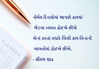 હા. અત્યારે ઘરે રહીને વિચાર આવે છે કે નૉર્મલ દિવસોમાં આપણે કેટલો ફિઝુલ ખર્ચ કરતા હતા સમયનો. કામ સિવાયની કેટલી બધી બાબતોમાં સમયનો વ્યય થવા દેતા હતા. પછી બહાનાં કાઢતા હતા – આજકાલ ટાઈમ જ ક્યાં છે, જુઓને. લાઈફ કેટલી બિઝી થઈ ગઈ છે.