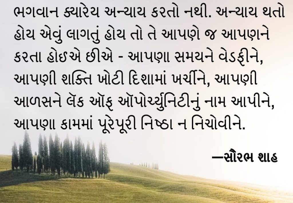 સમજવાનું આ છે આપણે. ભગવાન ક્યારેય અન્યાય કરતો નથી. અન્યાય થતો હોય એવું લાગતું હોય તો તે આપણે જ આપણને કરતા હોઈએ છીએ – આપણા સમયને વેડફીને, આપણી શક્તિ ખોટી દિશામાં ખર્ચીને, આપણી આળસને લૅક ઑફ ઑપોર્ચ્યુનિટીનું નામ આપીને, આપણા કામમાં પૂરેપૂરી નિષ્ઠા ન નિચોવીને. આવી રીતે જિંદગી જીવનારાઓ જીવનમાં ઉપર ન આવે અને મને અન્યાય થાય છે એવું જતાવે એ વળી ક્યાંનો ન્યાય? એવા લોકો માટે સહાનુભૂતિ પણ કેવી રીતે હોઈ શકે?