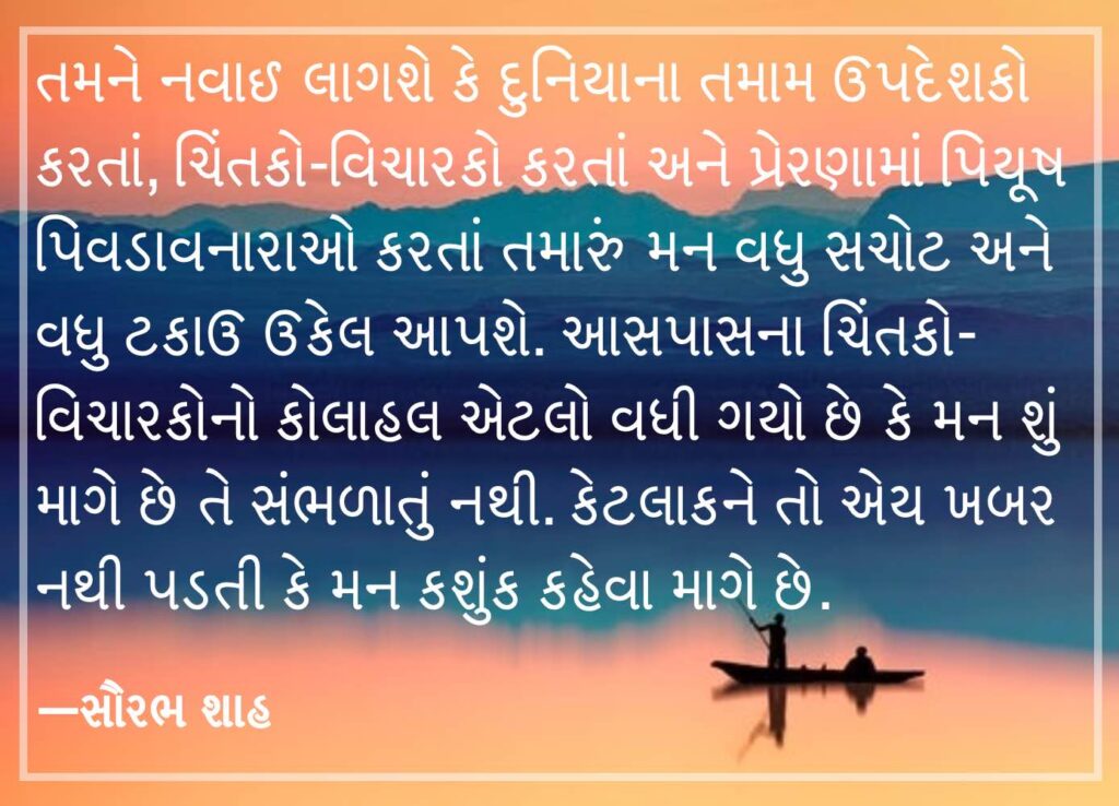 રાત્રે એરકન્ડિશનરનો ધીમો ગણગણાટ પણ ન હોય, ટીવી શાંત થઈ ગયું હોય અને રસ્તા પરનો ટ્રાફિક જંપી ગયો હોય ત્યારે જે સંભળાય છે તે ખામોશી નથી, એ રાતનો અવાજ છે. આ રીતે મનનો અવાજ સાંભળવાની ટેવ પડી ગયા પછી ચિંતનના ચિચૂકા કે પ્રેરણાના પાંચીકાઓથી રમવાની જરૂર રહેતી નથી. જાત જેવો ઉત્તમ ગુરુ બીજો કોઈ નથી. તમે કયા સંજોગોમાંથી, કેવા અનુભવોમાંથી અને કઈ વિચારપ્રક્રિયામાંથી પસાર થયા છો એની સોએ સો ટકા જાણ માત્ર તમારા પોતાના મનને જ હોય છે. માટે જ એ મન તમારી કંઈપણ તકલીફોનાં લક્ષણ તરત જ પારખી લે છે, નિદાન પણ એ જ કરે છે અને ઉપચાર પણ એ જ કરી શકે એમ છે.