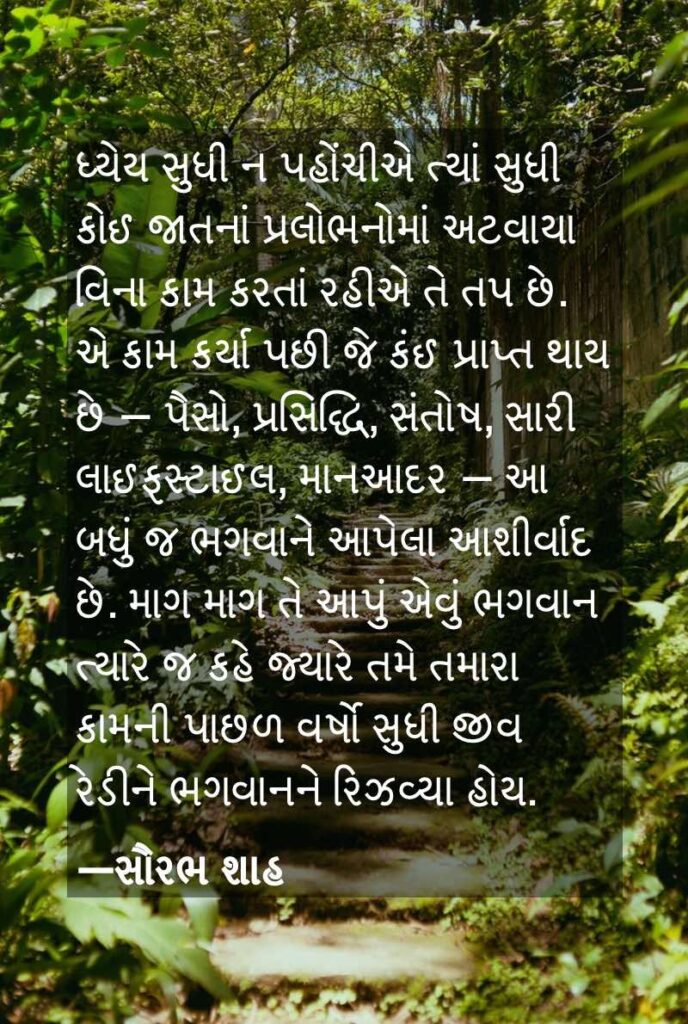 ધ્યેય સુધી ન પહોંચીએ ત્યાં સુધી કોઈ જાતનાં પ્રલોભનોમાં અટવાયા વિના કામ કરતાં રહીએ તે તપ છે. એ કામ કર્યા પછી જે કંઈ પ્રાપ્ત થાય છે – પૈસો, પ્રસિદ્ધિ, સંતોષ, સારી લાઈફસ્ટાઈલ, માનઆદર – આ બધું જ ભગવાને આપેલા આશીર્વાદ છે. માગ માગ તે આપું એવું ભગવાન ત્યારે જ કહે જ્યારે તમે તમારા કામની પાછળ વર્ષો સુધી જીવ રેડીને ભગવાનને રિઝવ્યા હોય.