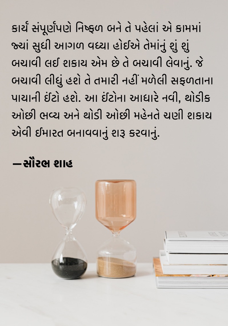 નિષ્ફળતા ઝળુંબી રહી હોય ત્યારે આ વાત ખાસ ધ્યાનમાં રાખવાની. કાર્ય સંપૂર્ણપણે નિષ્ફળ બને તે પહેલાં એ કામમાં જ્યાં સુધી આગળ વધ્યા હોઈએ તેમાંનું શું શું બચાવી લઈ શકાય એમ છે તે બચાવી લેવાનું. જે બચાવી લીધું હશે તે તમારી નહીં મળેલી સફળતાના પાયાની ઈંટો હશે. આ ઈંટોના આધારે નવી, થોડીક ઓછી ભવ્ય અને થોડી ઓછી મહેનતે ચણી શકાય એવી ઈમારત બનાવવાનું શરૂ કરવાનું.