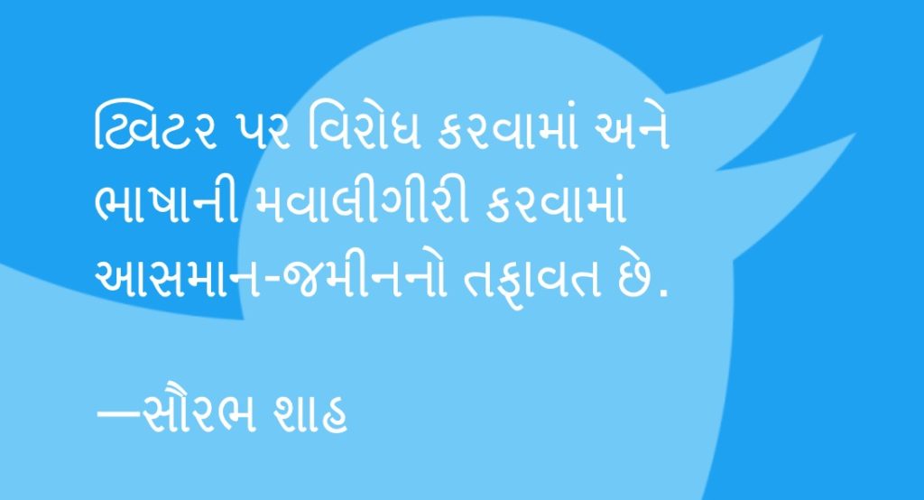૩. ટ્વિટર પર જે કંઈ વાંચવા મળે તે કોણે લખ્યું છે તેની તપાસ કરો. એ મોટી નોટ છે કે ખોટી નોટ છે એ તો તપાસો પહેલાં. આ હેન્ડલ પેરડી અકાઉન્ટ કે ફૅનક્લબનું નથી એ પણ તપાસો. અભિપ્રાય આપવાની એની લાયકાત કેટલી છે તે જાણવાની કોશિશ કરો. ખરેખર કોઈ અધિકારી વ્યક્તિ હોય તો એનો વિરોધ કરવો હોય તો ભલે કરો પણ એ વિરોધ કરવામાં વિવેક રાખો. મને અહીં વળી કોણ ઓળખવાનું છે એવું માનીને ગમે તેવી ભાષા વાપરશો તો તમે તમારી જાત આગળ પણ ખુલ્લા પડી જશો. ટ્વિટર પર વિરોધ કરવામાં અને ભાષાની મવાલીગીરી કરવામાં આસમાન-જમીનનો તફાવત છે. કોઈ બિનઅધિકારી વ્યક્તિનો વિરોધ કરવાનું મન થાય તો એ ચળ દબાવી રાખવી. જેનું કોઈ વજૂદ જ નથી એવી વ્યક્તિ સાથે શા માટે જીભાજોડી કરવી?