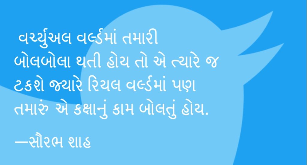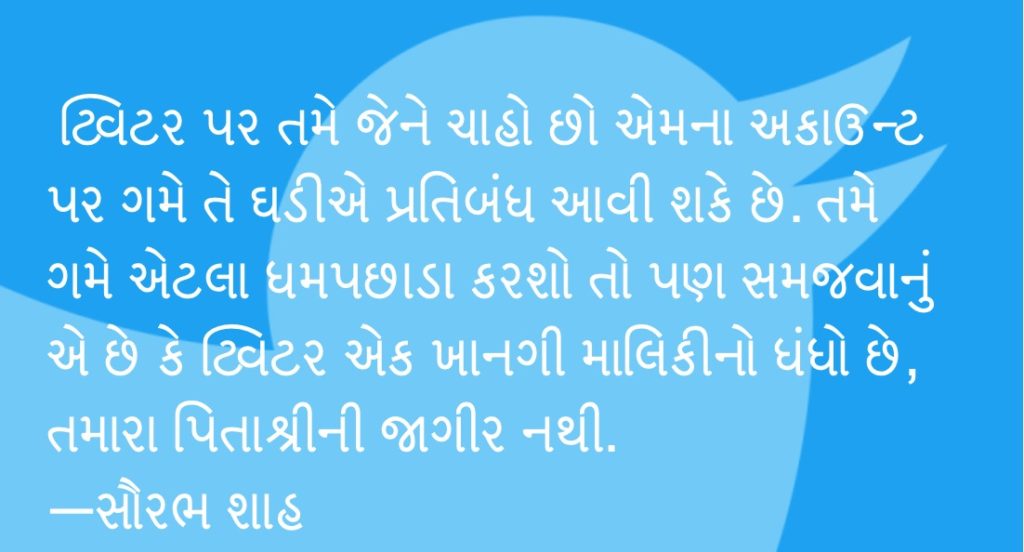 ૧૫. જતાં પહેલાં છેલ્લી વાત સાંભળતા જાઓ. ટ્વિટર પર તમે જેને ચાહો છો એમના અકાઉન્ટ પર ગમે તે ઘડીએ પ્રતિબંધ આવી શકે છે. તમે ગમે એટલા ધમપછાડા કરશો તો પણ સમજવાનું એ છે કે ટ્વિટર એક ખાનગી માલિકીનો ધંધો છે, તમારા પિતાશ્રીની જાગીર નથી. ટ્વિટર, ફેસબુક અને યુટ્યુબે અમેરિકાના પ્રમુખ ડોનાલ્ડ ટ્રમ્પ સત્તા પર હતા ત્યારે એમને બૅન કર્યા હતા અને ભવિષ્યમાં (2024માં) તેઓ જો ચૂંટણી લડશે તો પણ અમે એમના પરનો પ્રતિબંધ નહીં હટાવીએ ત્યાં સુધીની બદમાશી આ સોશ્યલ મીડિયાના માલિકો ઓપનલી કરી શકે છે. તમે પોતે પણ ગમે ત્યારે બ્લૉક થઈ શકો છો. તમને ગમતાં હેન્ડલ બ્લૉક થાય તો જરા ખાંખાખોળા કરશો તો જડી જશે કે કઈ નવી આઇડેન્ટિટી સાથે તેઓ પાછા રણમેદાનમાં આવ્યા છે. ટ્રુ ઇન્ડોલોજિથી માંડીને અજિત ભારતી સુધીના અનેક અકાઉન્ટ્સના જન્મ-પુનર્જન્મ થયા છે. તમારે આ લખચોરાશીની લપ્પનછપ્પનમાં ન પડવું હોય તો સાવધ રહેજો, જવાબદારીથી વર્તજો અને ટ્વીટ ટાઇપ કર્યા પછી બેવાર વાંચી જજો. કમ સે કમ જોડણીની ભૂલો તો સુધરશે જ.