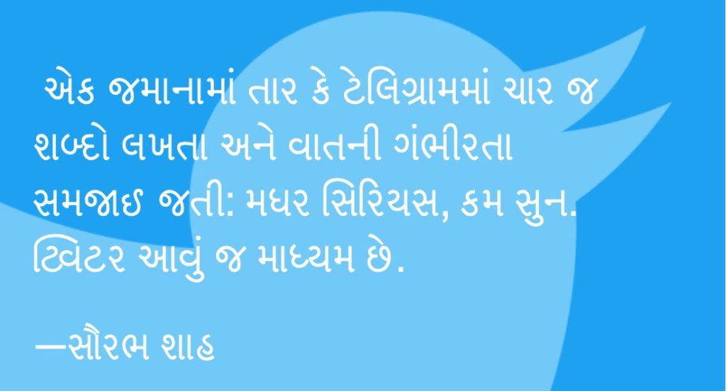 ૧૦. ટિવટરનો સૌથી મોટો ફાયદો એનું લાઘવ છે. ૨૮૦ કેરેક્ટર્સમાં અંગ્રેજી કે ગુજરાતી કે બીજી ભાષાઓના લગભગ પચાસ જેટલા શબ્દો સમાય. વધુમાં વધુ પાંચ-સાત વાક્યોમાં જ તમારે જે કહેવાનું હોય તે કહી દેવું પડે. (ક્યારેક મુદ્દો સવિસ્તર સમજાવવો હોય અને એક કરતાં વધારે ટ્વીટનો થ્રેડ બનાવો તે જુદી વાત છે પણ એવું ક્યારેક જ કરવાનું હોય.) લાંબી લાંબી વાતોની પળોજણમાં આમેય કોઈને રસ નથી હોતો. સ્કૂલમાં પ્રેસી કે વિચારસંક્ષેપ કરવાનું શીખવવામાં આવતું. મિતાહારની જેમ મિતભાષી હોવું પણ જરૂરી છે. ઓછા આહારની જેમ બોલવા-લખવામાં પણ ધ્યાન રાખવું. મુદ્દાસર, આડીતેડી વાતો કર્યા વિના, મૂળ વાતને વળગી રહીને લખવું કપરું છે પણ અનિવાર્ય છે એ તમને ટ્વિટર શીખવાડે છે. શીખી લેવું. એક જમાનામાં તાર કે ટેલિગ્રામમાં ચાર જ શબ્દો લખતા અને વાતની ગંભીરતા સમજાઈ જતી: મધર સિરિયસ, કમ સુન. ટ્વિટર આવું જ માધ્યમ છે.