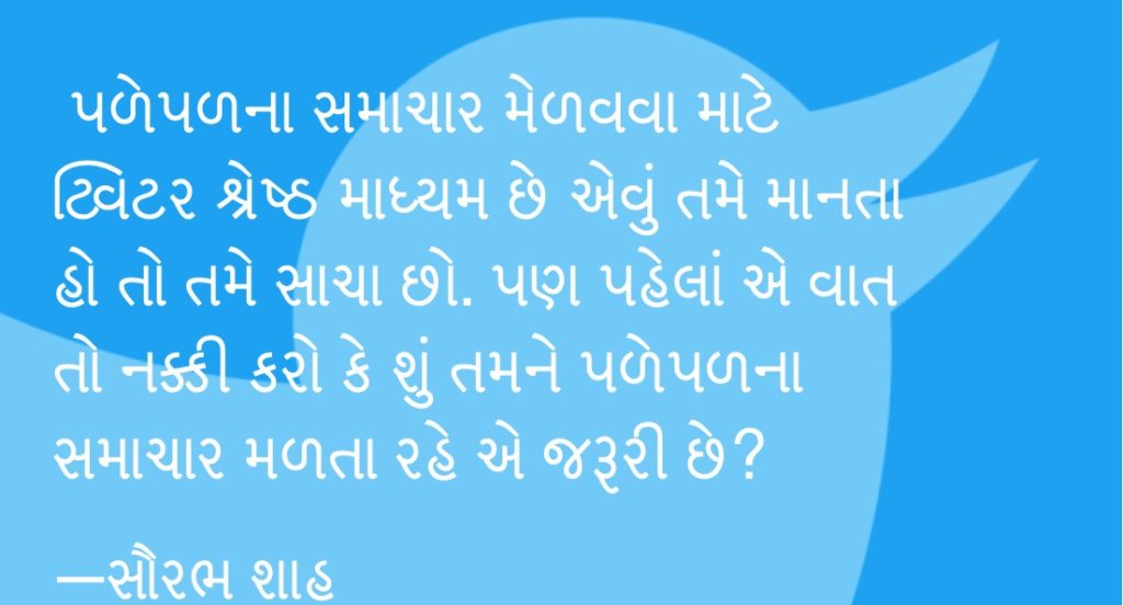 ૬. પળેપળના સમાચાર મેળવવા માટે ટ્વિટર શ્રેષ્ઠ માધ્યમ છે એવું તમે માનતા હો તો તમે સાચા છો. પણ પહેલાં એ વાત તો નક્કી કરો કે શું તમને પળેપળના સમાચાર મળતા રહે એ જરૂરી છે? સચીન વાઝે પાસેથી સાત મોંઘી ગાડીઓ મળી આવ્યા પછી આઠમી ગાડી અને એક લકઝરી બાઈક પણ મળ્યાં એ સમાચાર તમને બપોરે ટ્વિટર પર મળે કે રાત્રે ટીવીના ન્યૂઝમાં મળે તેથી તમારા જીવનમાં કે કામકાજમાં શું મોટો ફરક આવી જવાનો છે? મુખ્તાર અન્સારીને પંજાબથી યુપી લઈ જતો પોલીસ કાફલો અત્યારે ક્યાં પહોંચ્યો તેની મિનિટે મિનિટની ખબર રાખીને તમે શું મેળવી લેશો. તમે પોતે ન્યૂઝ પેપર કે ટીવીની ન્યૂઝ ચેનલ કે ડિજિટલ મીડિયાના ન્યૂઝ પોર્ટલ સાથે સંકળાયેલા હો તો અલગ વાત છે. બાકી મનોરંજન કે ચીપ થ્રિલ મેળવવામાં તમારો ટાઈમ, તમારી એનર્જી બરબાદ થવાનાં છે.
