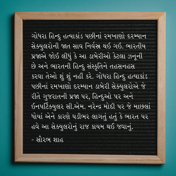 ગોધરા હિન્દુ હત્યાકાંડ પછીનાં રમખાણો દરમ્યાન સેક્યુલરોની જાત સાવ નિર્વસ્ત્ર થઈ ગઈ. ભારતીય પ્રજાએ જોઈ લીધું કે આ ડાબેરીઓ કેટલા ઝનૂની છે અને ભારતની હિન્દુ સંસ્કૃતિને તહસનહસ કરવા તેઓ શું શું નહીં કરે. ગોધરા હિન્દુ હત્યાકાંડ પછીનાં રમખાણો દરમ્યાન ડાબેરી સેક્યુલરોએ જે રીતે ગુજરાતની પ્રજા પર, હિન્દુઓ પર અને ઈનપર્ટિક્યુલર સી.એમ. નરેન્દ્ર મોદી પર જે માછલાં ધોયાં એને કારણે ઘડીભર લાગતું હતું કે ભારત પર હવે આ સેક્યુલરોનું રાજ કાયમ થઈ જવાનું. 2004ની લોકસભા ચૂંટણીમાં ભાજપે સત્તા ગુમાવી. 2009માં પણ સોનિયા સરકાર જ આવી. એ દસકો હતાશાનો દાયકો હતો. પણ ફસ્ટ્રેશનના એ દસ વર્ષ દરમ્યાન ભારેલો અગ્નિ પ્રજ્વળતો રહ્યો. કૉન્ગ્રેસની બનાવટી મુસ્લિપ્રીતિ વારંવાર ખુલ્લી થતી રહી. સાચર કમિટીનાં રેકમેન્ડેશન્સ વખતે વડા પ્રધાન મનમોહન સિંહે જ્યારે કહ્યું કે આ દેશનાં સંસાધનો પર મુસ્લિમોને હક્ક સૌથી પહેલો છે ત્યારે તો વાતની પરાકાષ્ઠા આવી ગઈ. આની સામે ગુજરાતના સી.એમ. તરીકે મુસ્લિમોનો પ્રેમ જીતવા સદ્ભાવના યાત્રાએ નીકળેલા નરેન્દ્ર મોદીએ મંચ પર, જાહેર જનતા તથા ટીવી કૅમેરાની સામે ધરાર મુસ્લિમ આગેવાનો એમને જે પહેરાવવા માગતા હતા તે જાળીદાર વાટકા ટોપી પહેરવાનો ઈનકાર કર્યો. આવું કરવાની હિંમત હજુ સુધી કોઈએ દેખાડી નહોતી. કૉન્ગ્રેસી નેતાઓ કે મુલાયમ તથા લાલુ જેવા નેતાઓ તો પોતાના ખિસ્સામાં જ આવી લીલી-સફેદ ટોપીઓ લઈને ફરતા અને તક મળે ત્યારે ઈફ્તારીઓમાં ઘૂસીને ટોપીવાળા ફોટાઓ પડાવતા. વાજપેયીજીએ પણ 2004ના ચૂંટણી પ્રવાહ દરમ્યાન મરણિયા થઈને ભાજપ માટે સત્તા બચાવવાના પ્રયાસરૂપે લીલી ટોપી પહેરેલા ફોટાઓ પડાવ્યા હતા. સી.એમ. મોદીની ખૂબ ટીકા થઈ. પણ એની સામે એમણે પુરવાર કરી બતાવ્યું કે 2002 પછી છેક 2014 સુધી (અને હજુ પણ) ગુજરાત મુસ્લિમો માટે એકદમ સુરક્ષિત હતું. અઝીમ પ્રેમજીથી લઈને રતન તાતા સુધીના દિગ્ગજ ઉદ્યોગ આગેવાનોએ 2002 પછી મોદીની ખુલ્લા મોઢે ટીકા કરી હતી તે જ ઉદ્યોગપતિઓ હવે મોદીના રાજમાં હજારો કરોડ રૂપિયાનું ઈન્વેસ્ટમેન્ટ કરવા માટે લાઈનમાં ઊભા રહી ગયા. આ પ્રભાવ ગુજરાતે, ગુજરાતની પ્રજાએ અને ગુજરાતની પ્રજાના સિંહની છાતી ધરાવતા નેતા મોદીએ ઊભો કર્યો.