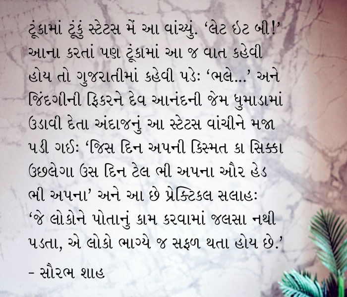 ટૂંકામાં ટૂંકું સ્ટેટસ મેં આ વાંચ્યું. ‘લેટ ઇટ બી!’ આના કરતાં પણ ટૂંકામાં આ જ વાત કહેવી હોય તો ગુજરાતીમાં કહેવી પડેઃ ‘ભલે…’ અને જિંદગીની ફિકરને દેવ આનંદની જેમ ધુમાડામાં ઉડાવી દેતા અંદાજનું આ સ્ટેટસ વાંચીને મજા પડી ગઈઃ ‘જિસ દિન અપની કિસ્મત કા સિક્કા ઉછલેગા ઉસ દિન ટેલ ભી અપના ઔર હેડ ભી અપના’ અને આ છે પ્રેક્ટિકલ સલાહઃ ‘જે લોકોને પોતાનું કામ કરવામાં જલસા નથી પડતા, એ લોકો ભાગ્યે જ સફળ થતા હોય છે.’