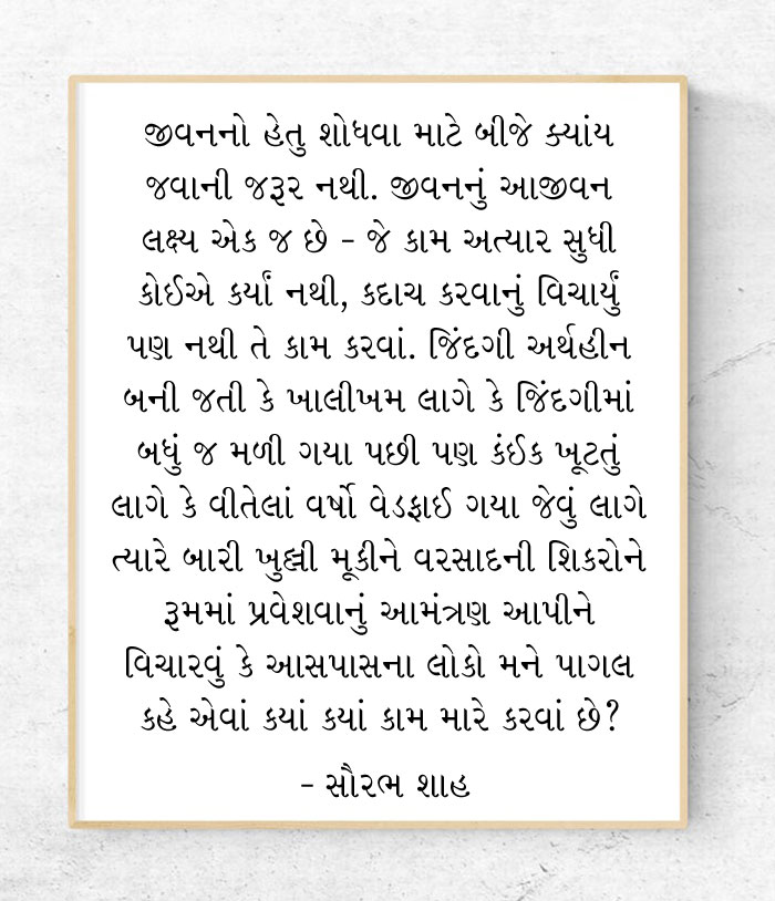 જીવનનો હેતુ શોધવા માટે બીજે ક્યાંય જવાની જરૂર નથી. જીવનનું આજીવન લક્ષ્ય એક જ છે- જે કામ અત્યાર સુધી કોઈએ કર્યાં નથી, કદાચ કરવાનું વિચાર્યું પણ નથી તે કામ કરવાં. જિંદગી અર્થહીન બની જતી કે ખાલીખમ લાગે કે જિંદગીમાં બધું જ મળી ગયા પછી પણ કંઈક ખૂટતું લાગે કે વીતેલાં વર્ષો વેડફાઈ ગયા જેવું લાગે ત્યારે બારી ખુલ્લી મૂકીને વરસાદની શિકરોને રૂમમાં પ્રવેશવાનું આમંત્રણ આપીને વિચારવું કે આસપાસના લોકો મને પાગલ કહે એવાં કયાં કયાં કામ મારે કરવાં છે?